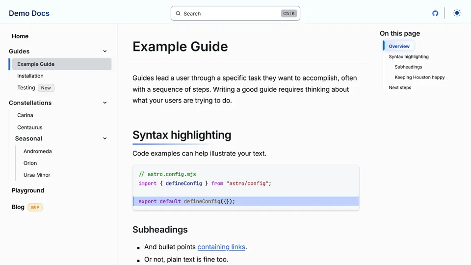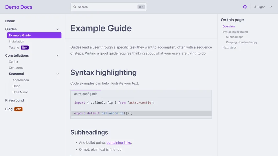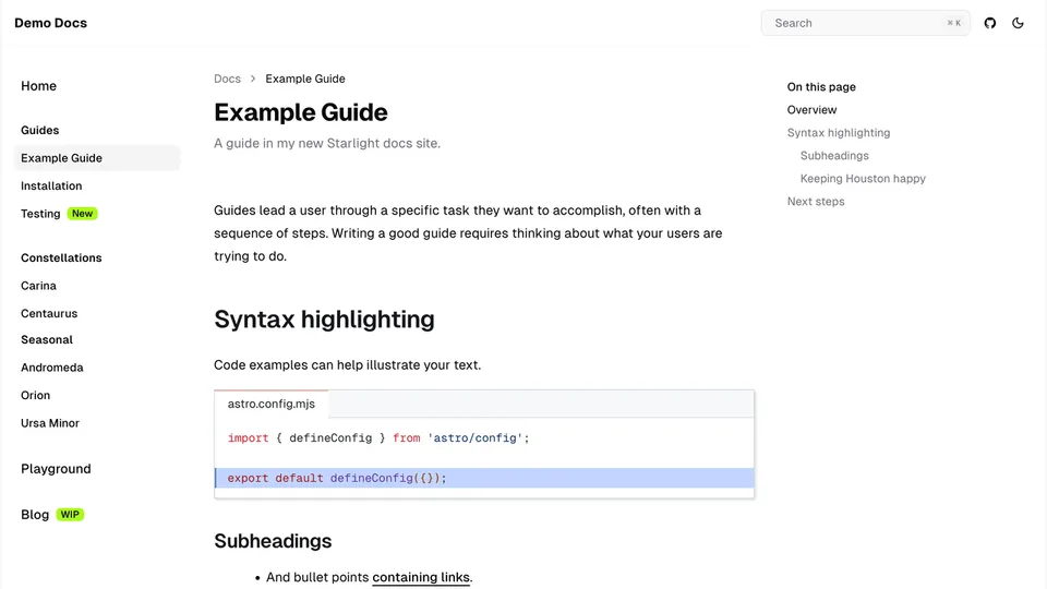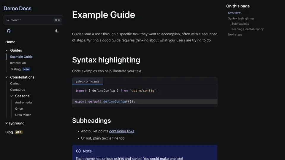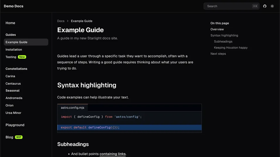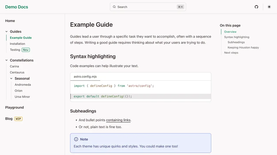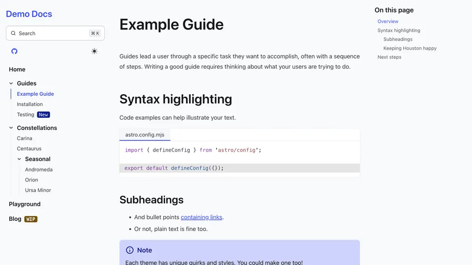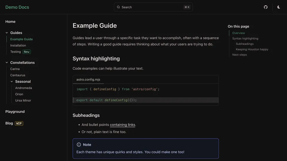 Preview a list of all themes below or try them out interactively on the Starlight Themes demo site.